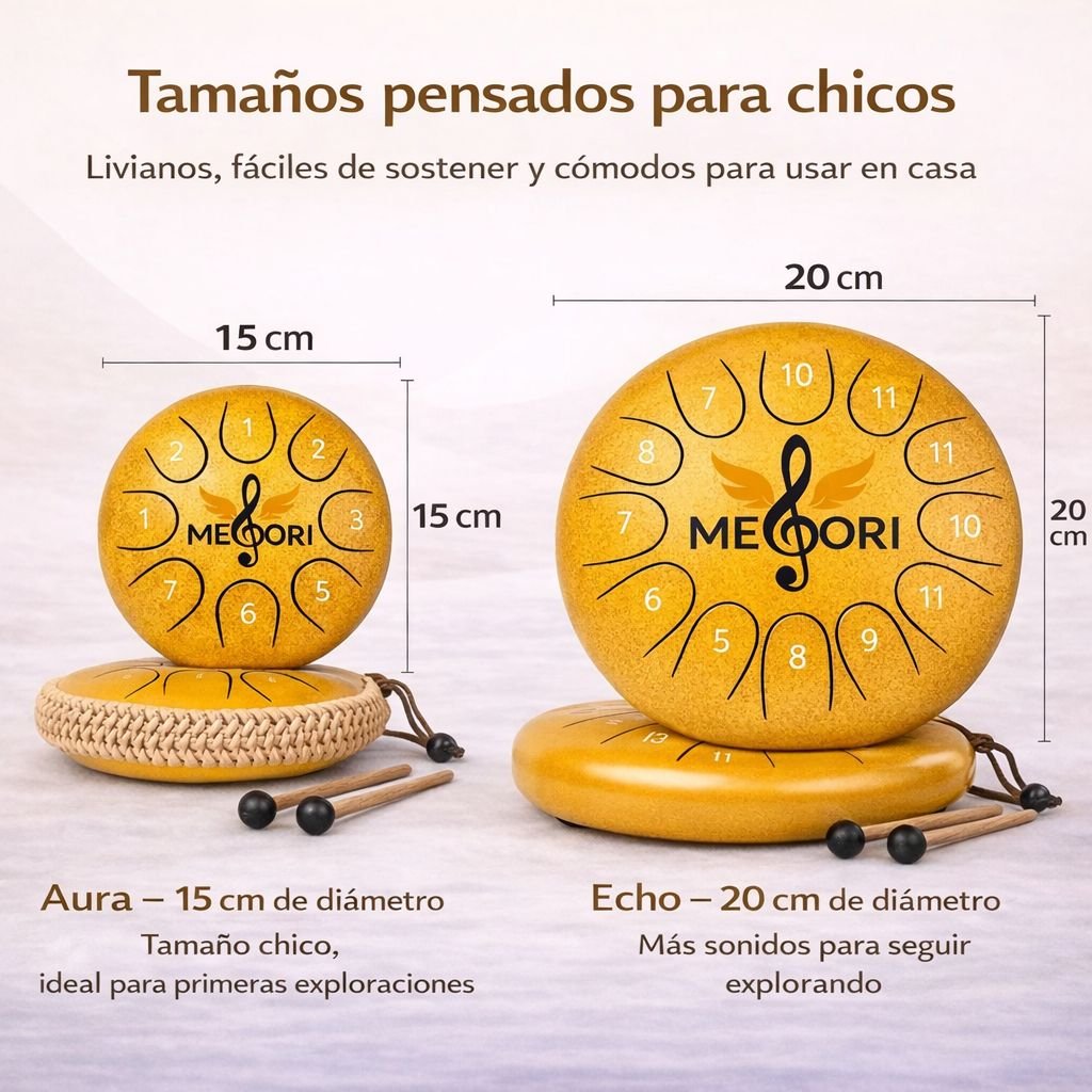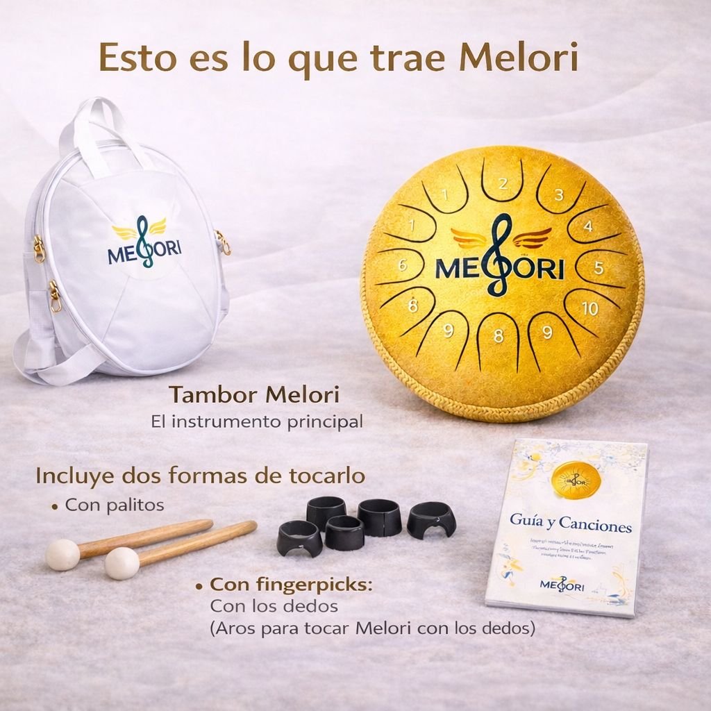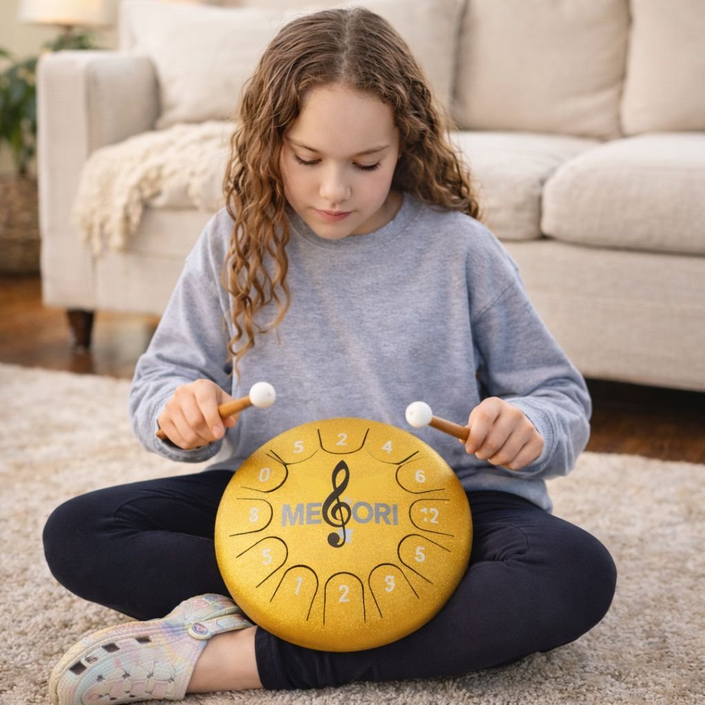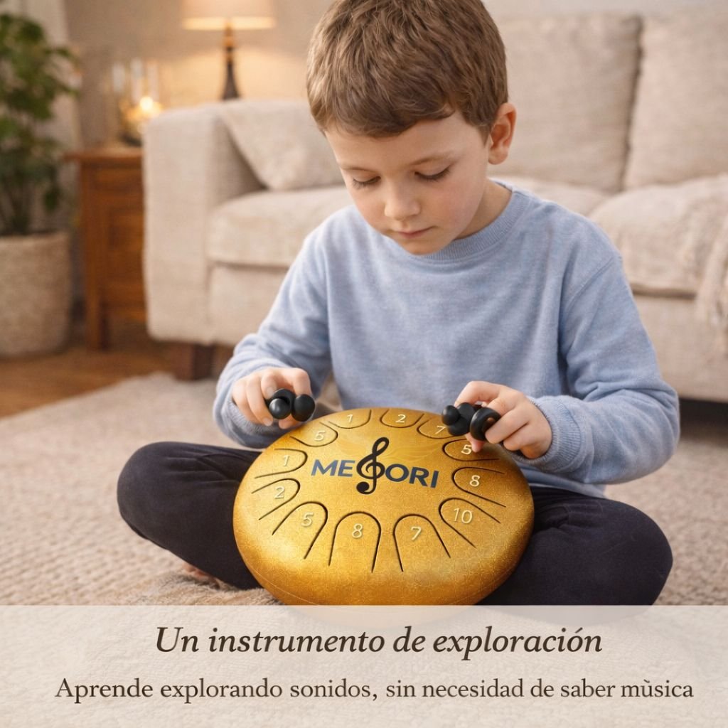 Melori es un instrumento de exploración musical, pensado para que los chicos puedan tocar sin frustrarse. Tiene un número limitado de sonidos cuidadosamente elegidos para que cualquier combinación suene armoniosa. Los números funcionan como una guía visual, ayudando a reconocer y repetir sonidos, sin necesidad de saber música. Los niños pueden interpretar canciones en una determinada escala. Los chicos aprenden escuchando, probando y repitiendo los sonidos que más les gustan, ya sea con palitos o con los dedos. No hay notas incorrectas ni formas erradas de usarlo: desde el primer día, suena bien.